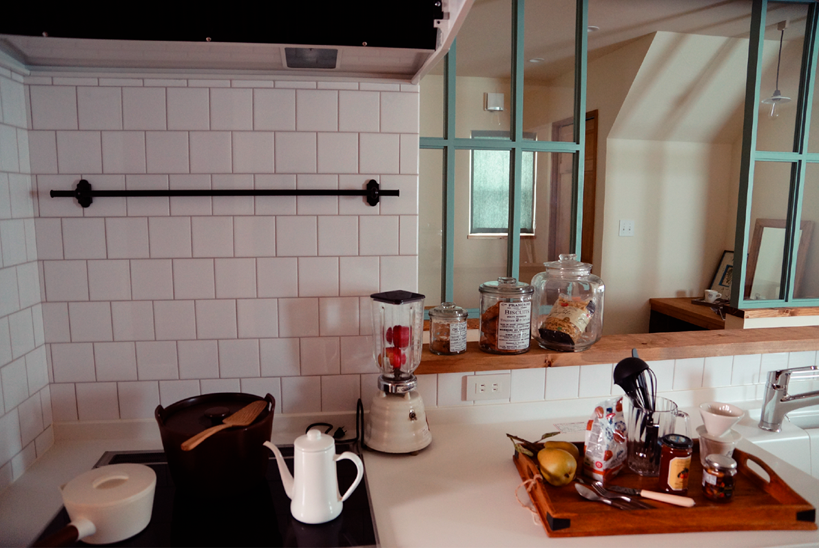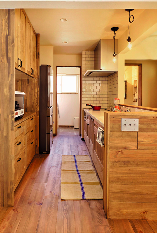 | キッチン | オリジナルシステムキッチン、食洗器、ガスコンロ、無垢面材、ステンレスカウンター |