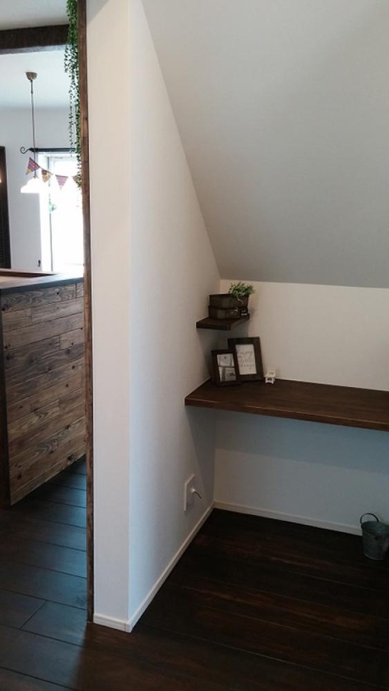 キッチン横の家事デスクでパソコンする人…。