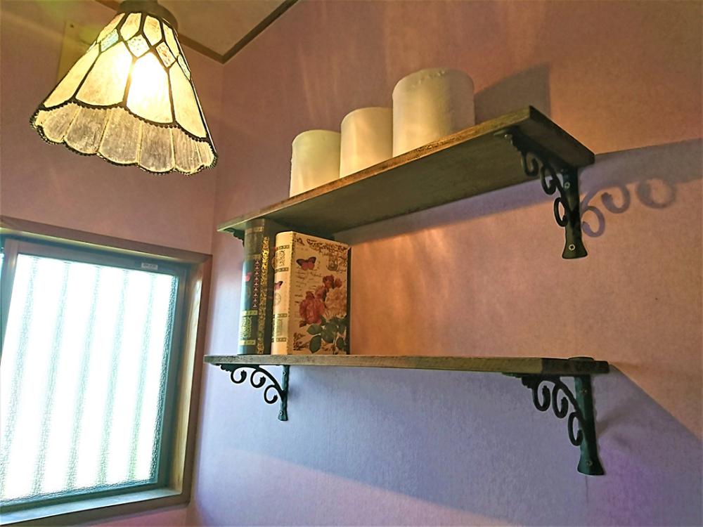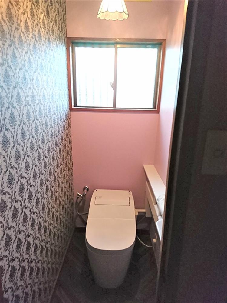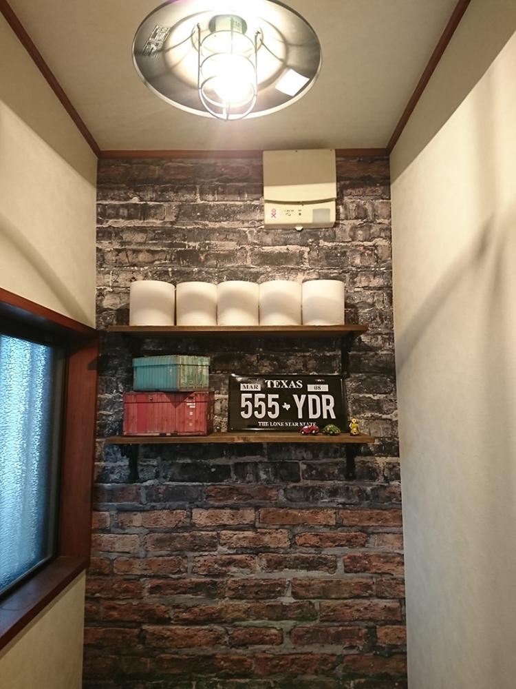 また、トイレを入れ替えたときに、 1階はビンテージ風のレンガ模様のクロス、 2階はダマスク柄のクロスをアクセントに張替えました。