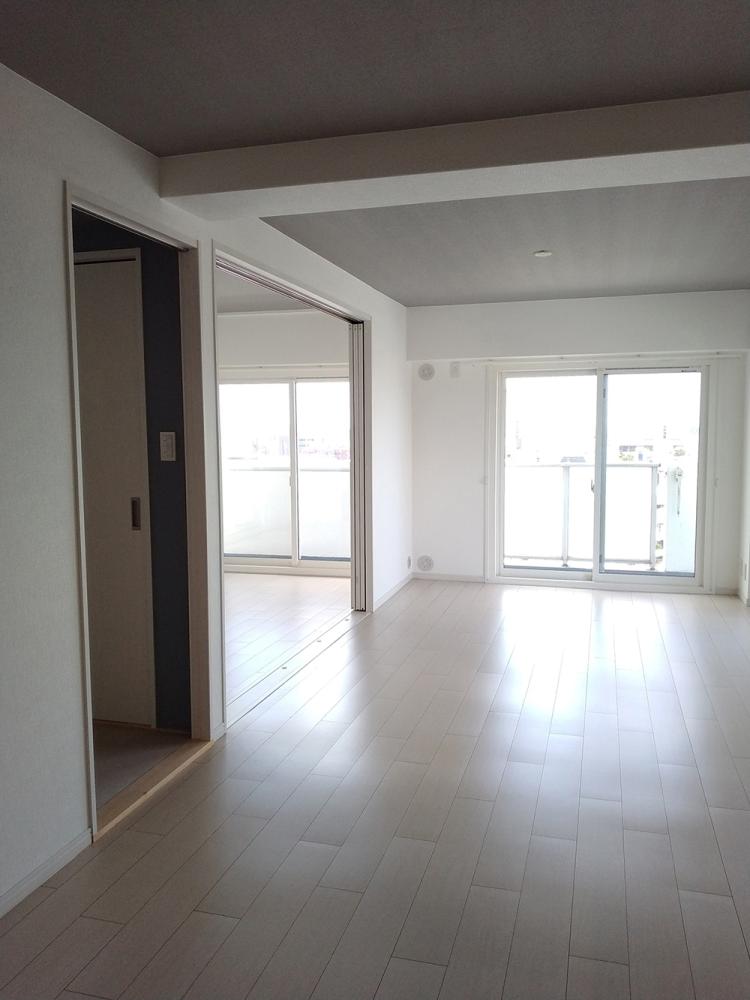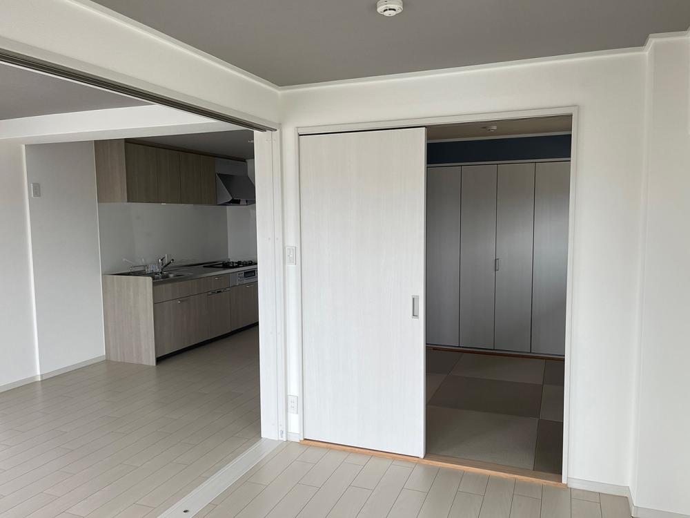 二間続きだった和室のうちバルコニー側を洋室にし、3枚引込戸でリビングとオープンになるよう間取りも変えました。